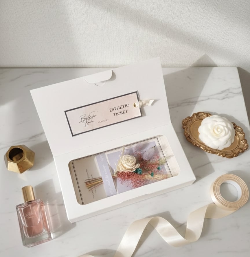 ボックスを開けた瞬間にちょっとした感動があるエステチケットとドライフラワーがセットになった女性が喜ぶギフトです。