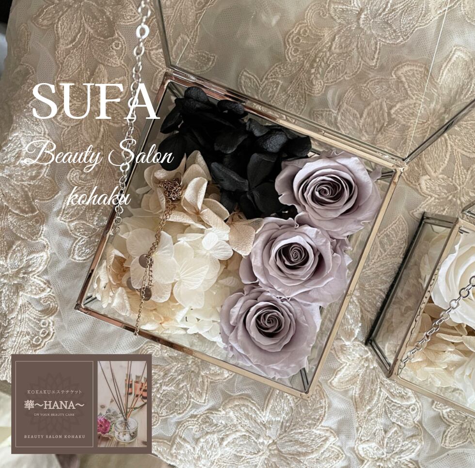 琥珀のエステチケット~華~110分コースとシックで洗練されたアレンジで人気を誇るSUFAからロマンチックなプリザーブドフラワーのガラスケースのコラボレーションギフト。