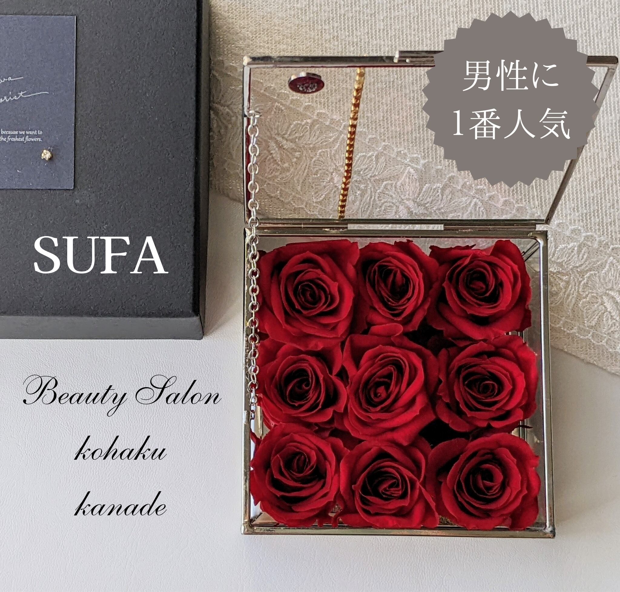 エステチケット~奏~90分コースとシックで洗練されたアレンジで人気を誇るSUFAからロマンチックなプリザーブドフラワーのガラスケースのコラボレーションギフト。