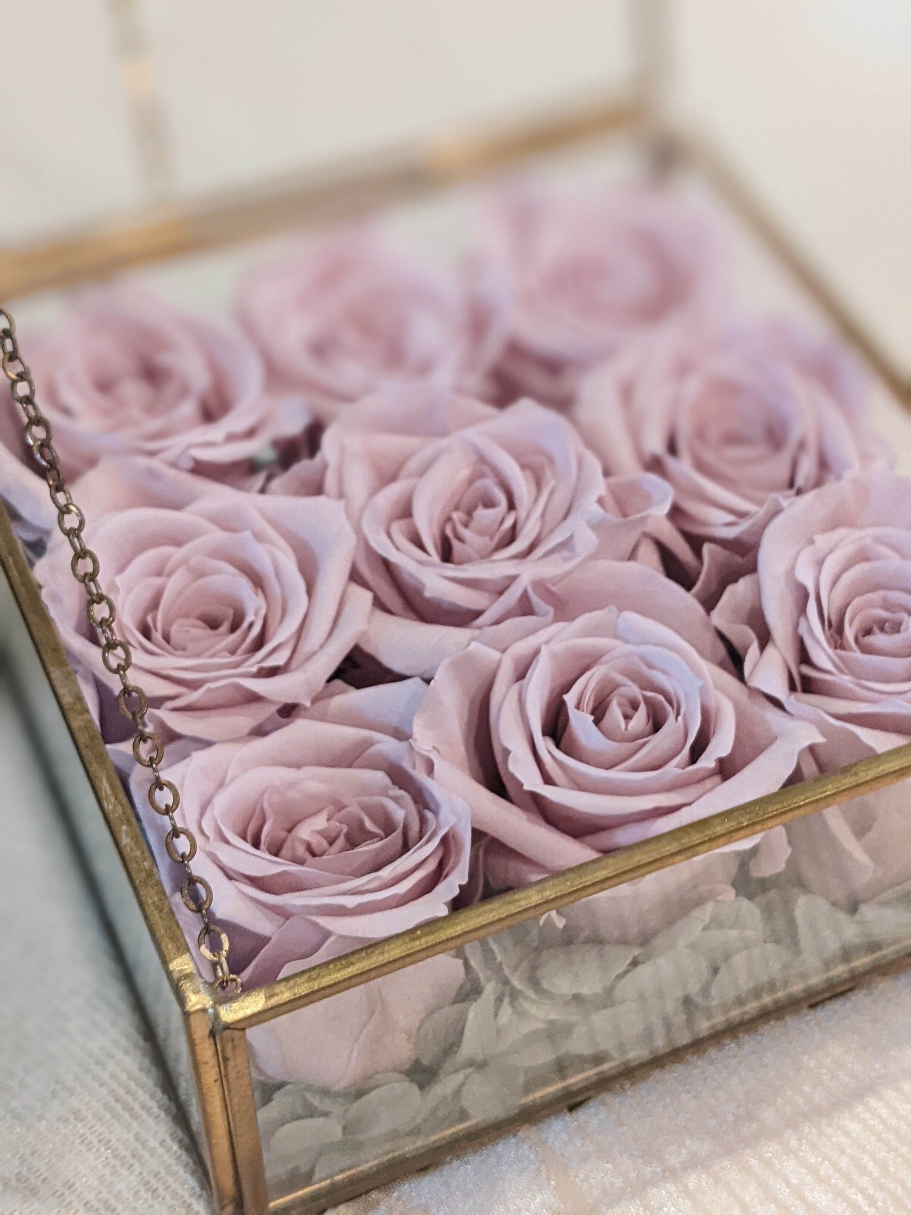 プリザーブドフラワーのバラをガラスの器に入れました。